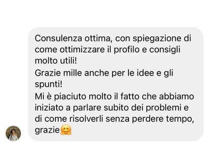 A tutto ciò, seguiranno due consulenze al mese, durante le quali faremo il punto della situazione sull’andamento del profilo.