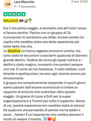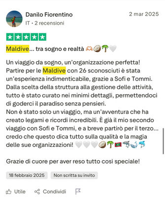 Vivremo un'esperienza unica esplorando una delle più belle isole local delle Maldive: Mathiveri! Nuoteremo con le mante e con gli squali, esploreremo un antico relitto, faremo snorkeling nella barriera corallina, faremo merenda in una lingua di sabbia in mezzo al nulla, visiteremo una scuola maldiviana, andremo alla ricerca dei delfini, pescheremo al tramonto e tanto altro!